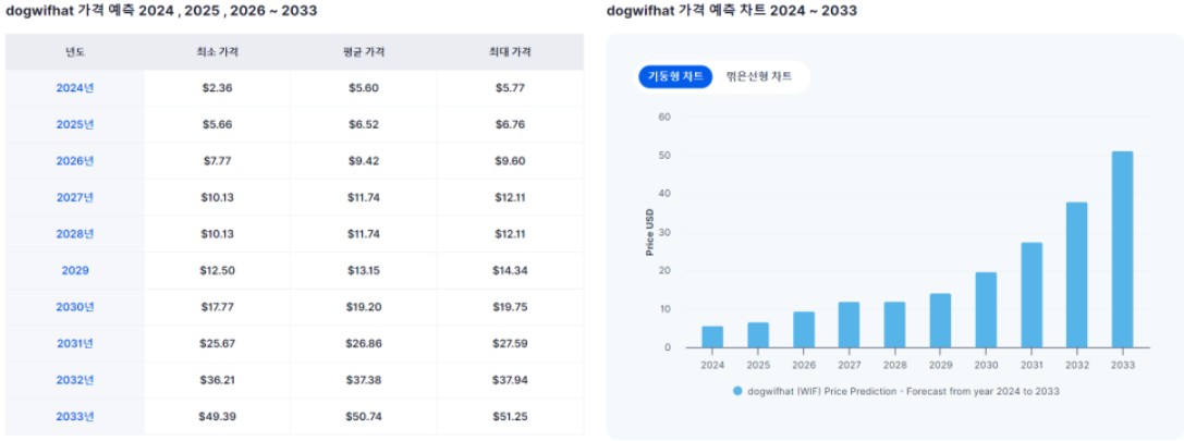 디지털 코인 프라이스 시세 예측 프로그램으로 살펴본 WIF 코인 시세 전망입니다. 현재 2.63달러에 거래되고 있으며, 올해 최대 5.77달러까지 상승을 전망하고 있습니다. 현재 시세의 약 2배 이상 달하는 가격대 입니다.