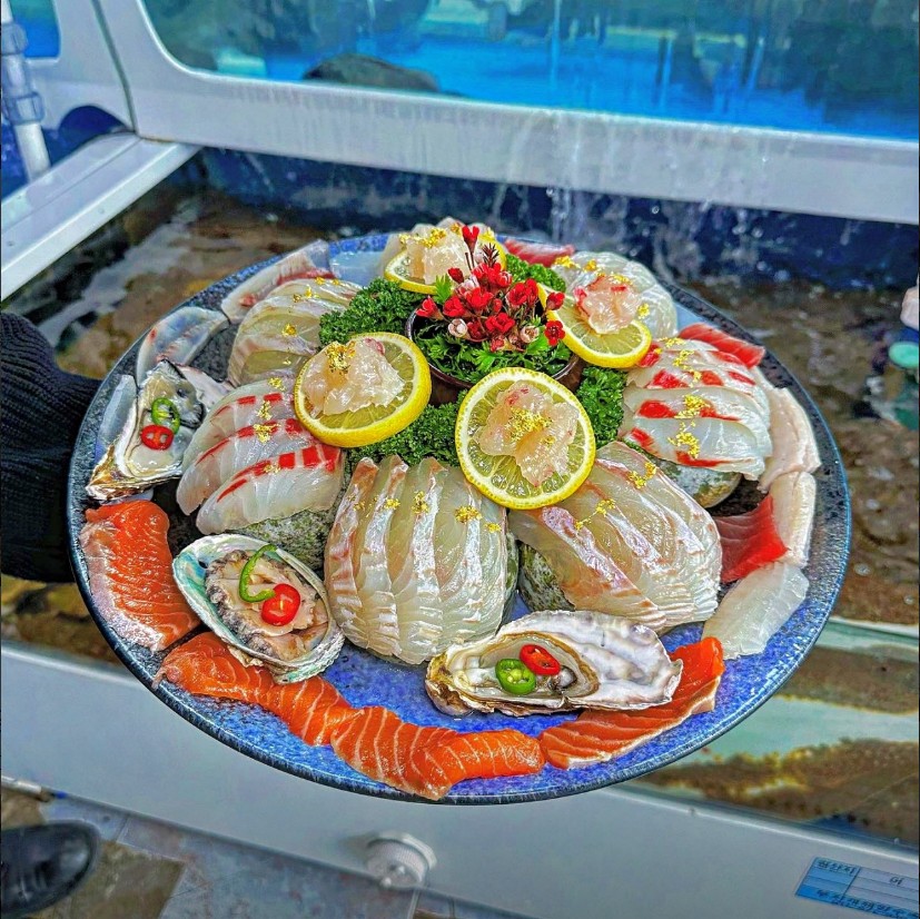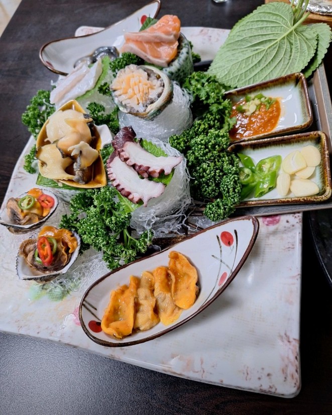 회, 해물6가지, 샐러드, 조개탕, 가오리찜, 콘치즈, 초무침, 초밥, 롤,낙지, 생선구이, 튀김, 매운탕