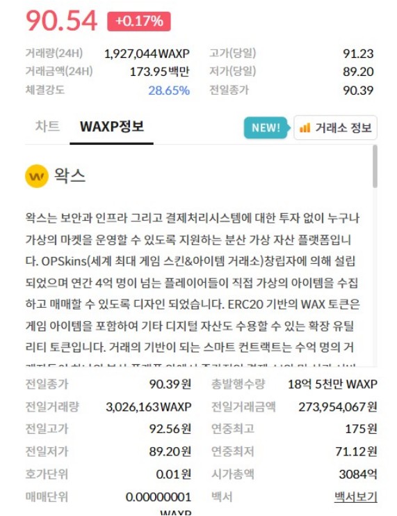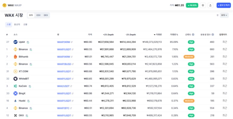 - 왁스코인은 해외 대형 거래소에도 상장되어 있지만, 주로 업비트에서 거래량이 많이 나오고 있습니다.